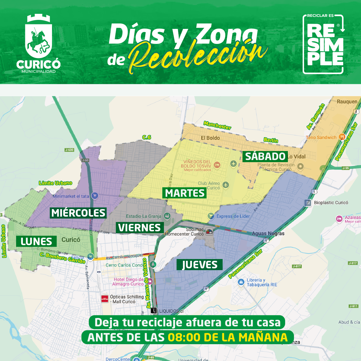 En el marco de la implementación de la Ley REP, la comuna de Curicó ha sido pionera en la región del Maule en dotar a los vecinos de un sistema de reciclaje semanal en los domicilios, contando con el apoyo de la empresa ReSimple. Como es un sistema nuevo requiere de algunos ajustes en cuanto a los días que pasa el camión en ciertos sectores.